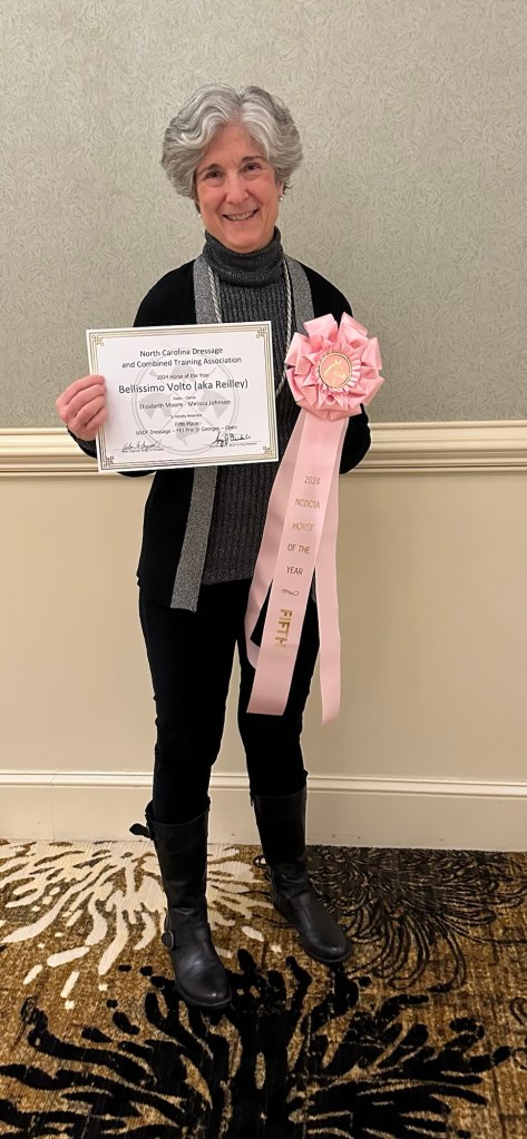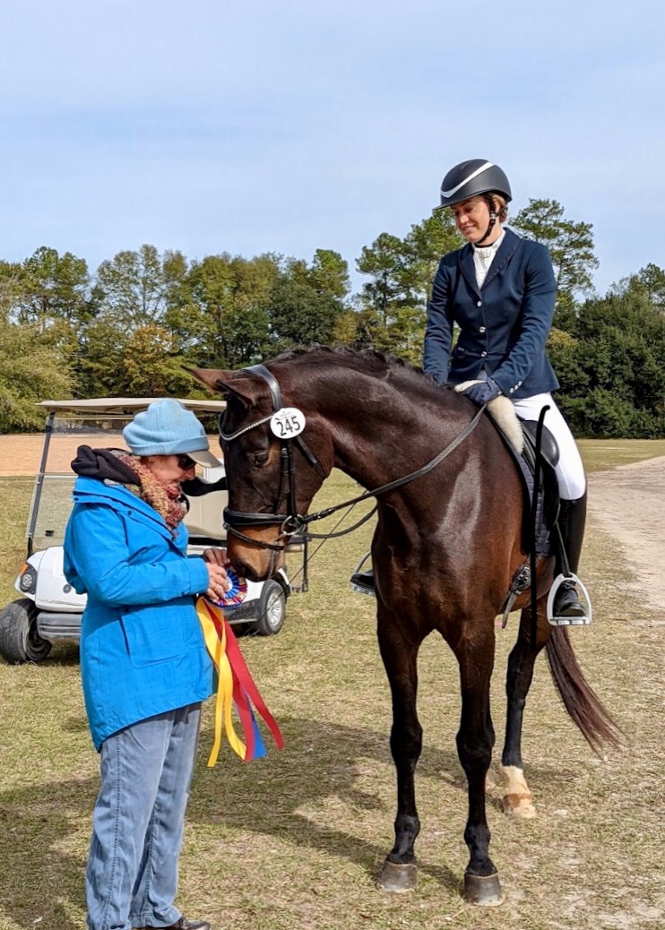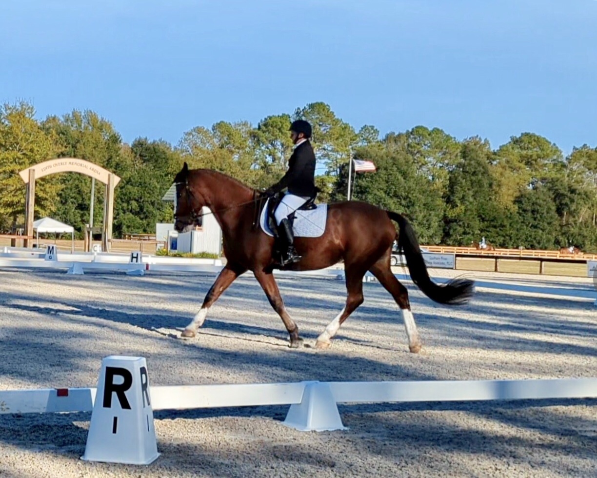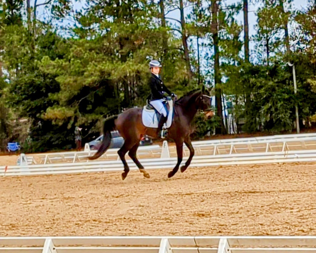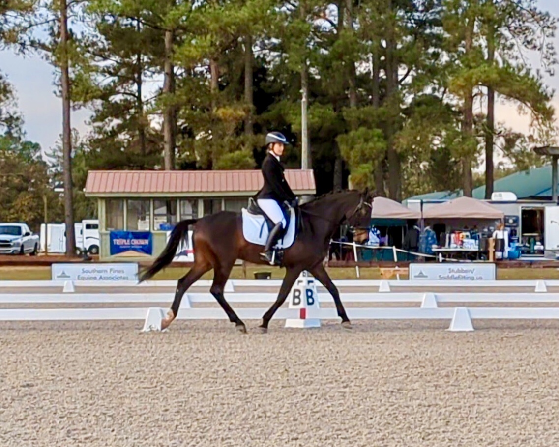 Elizabeth Coviello Moore and Melissa Johnson’s lovely Hanoverian gelding won the Open PSG Championships at the NCDCTA year end show held at the Carolina Horse Park in early Nov. 2024. This was only “Volto’s” 3rd time competing at that level, and Melissa has the ride on him much of the time. She hopes to earn some good scores at fourth level this season.