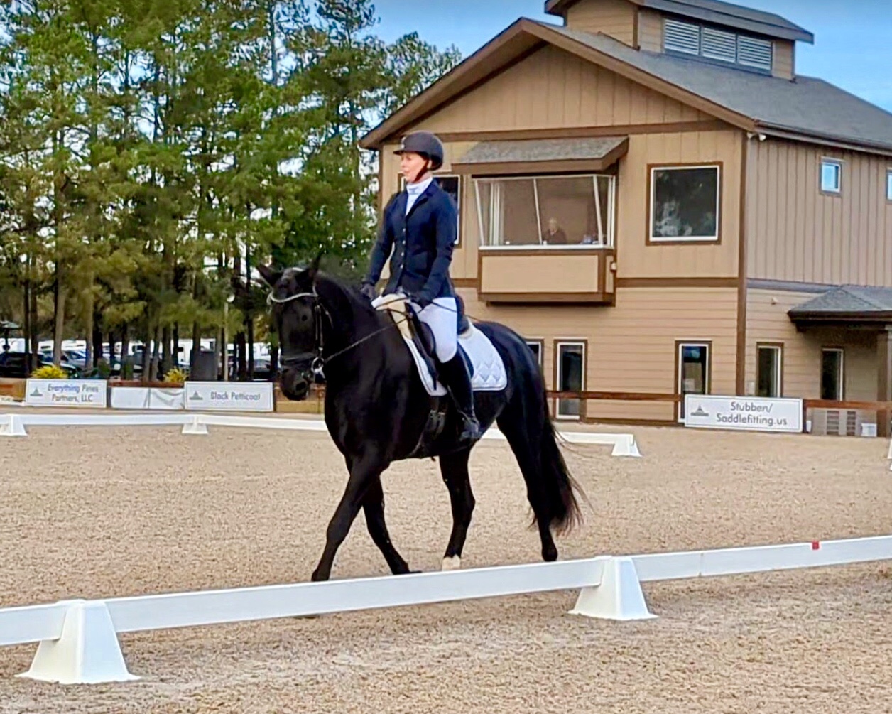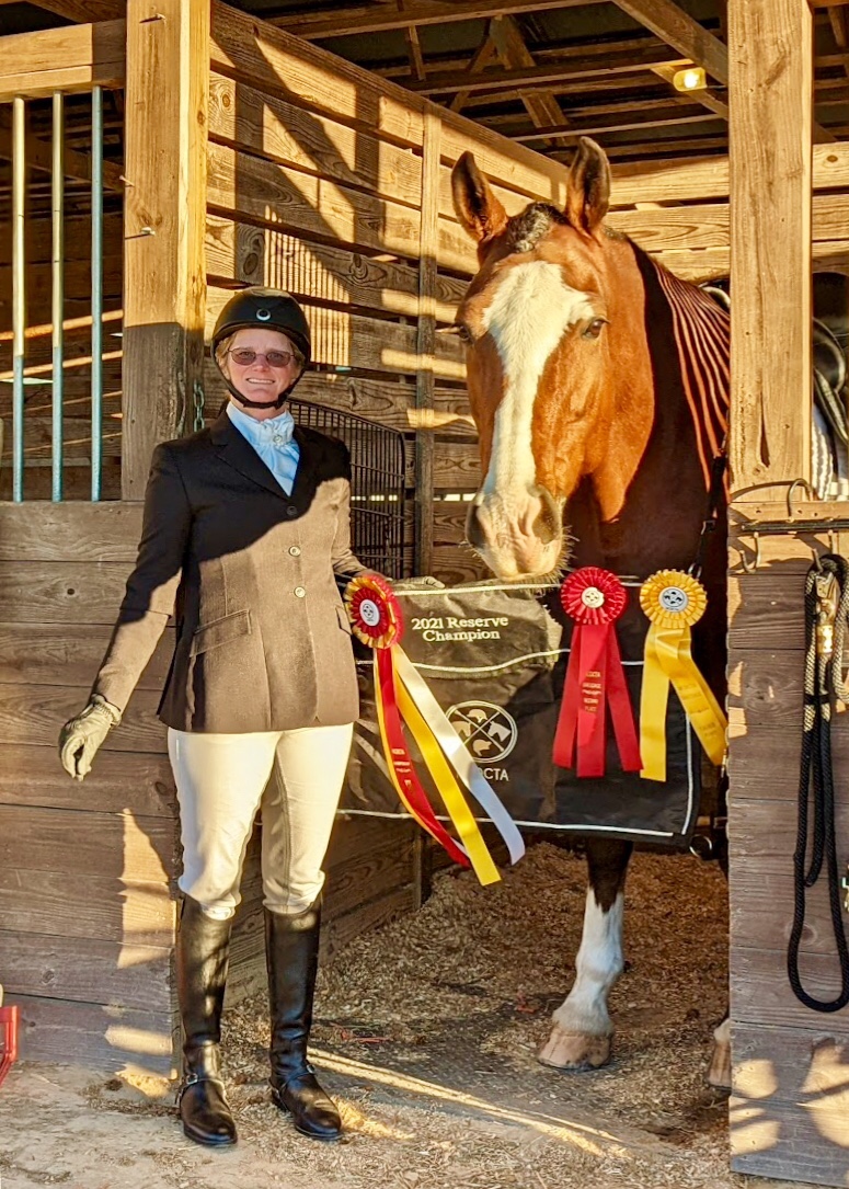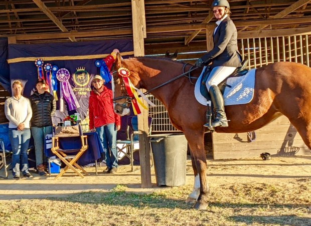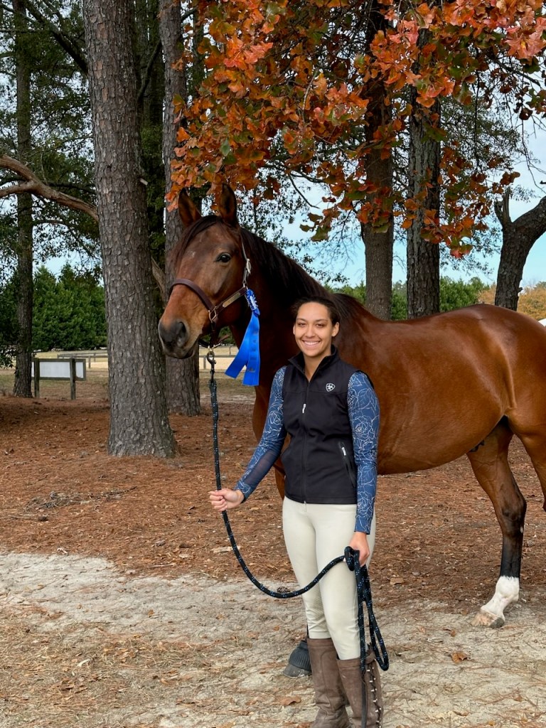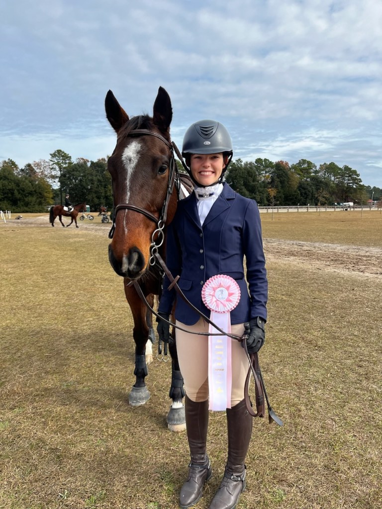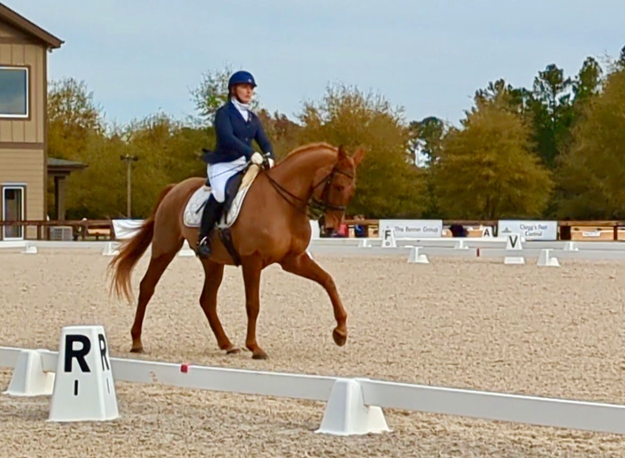 Elizabeth Coviello Moore and Melissa Johnson’s lovely Hanoverian gelding won the Open PSG Championships at the NCDCTA year end show held at the Carolina Horse Park in early Nov. 2024. This was only “Volto’s” 3rd time competing at that level, and Melissa has the ride on him much of the time. She hopes to earn some good scores at fourth level this season.