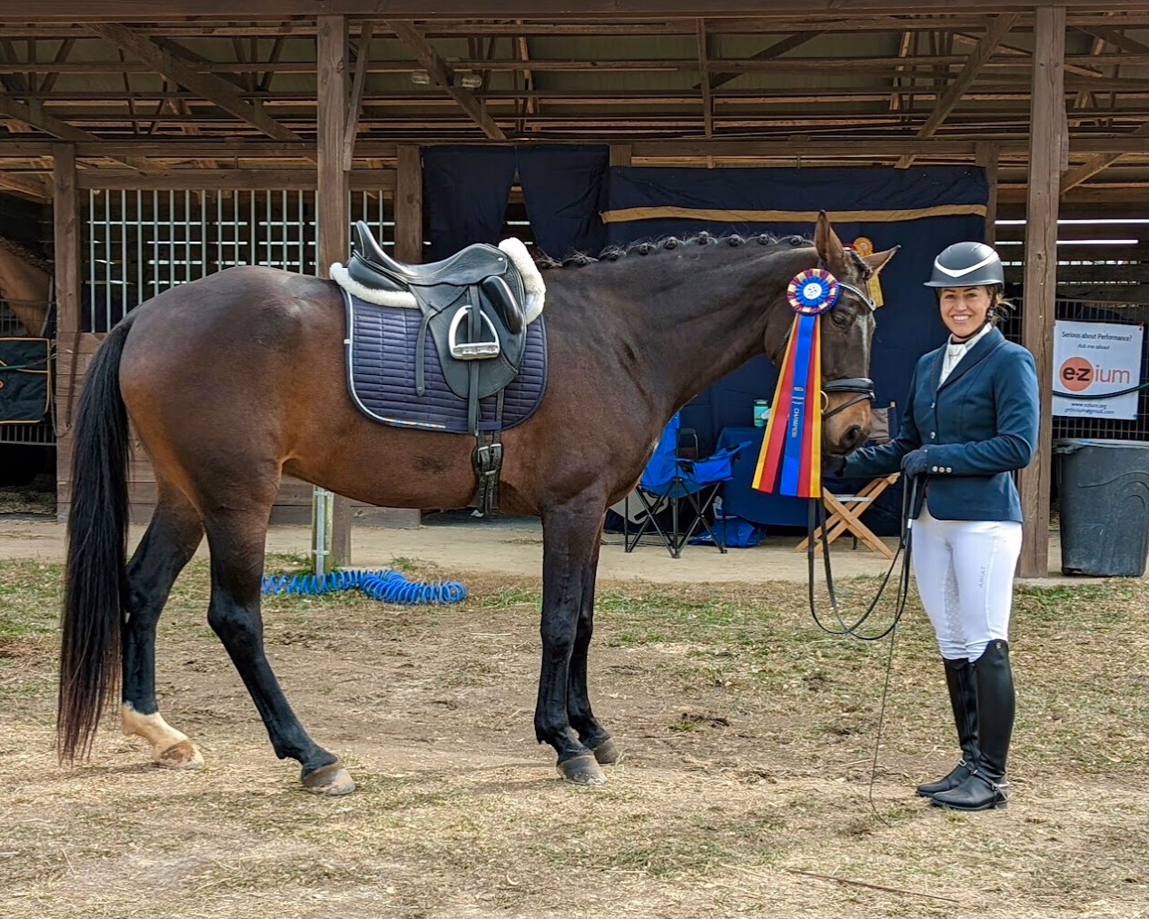 Elizabeth and Melissa Johnson’s horse Belissimo Volto (coming 10 yr. Hannoverian gelding) made their 4th level debut Sat. earning a 60.132 with an error in 4th 2, and a 63.462 in 4th 1. Volto was absolutely terrific and I am fortunate to have such a lovely horse to train. Sunday he warmed up very nicely but apparently I (Elizabeth) now need to admit I need a reader on occasion though, (especially in 4th 2 apparently) and that I also need to triple check the arena I am riding in, as I made some unnecessary mistakes which led to our being disqualified from the 4th level championships and made me annoyed with myself since we had earned a 70% in the same test at a schooling show 2 weeks before that! Thank you very much to our wonderful sponsors Custom Saddlery, Ezium, and Cartilast LLC, without which we could not do this amazing sport. All four of the horses we brought to the show go in Custom saddles and two use the Ezium supplement which has made a big difference in them both.