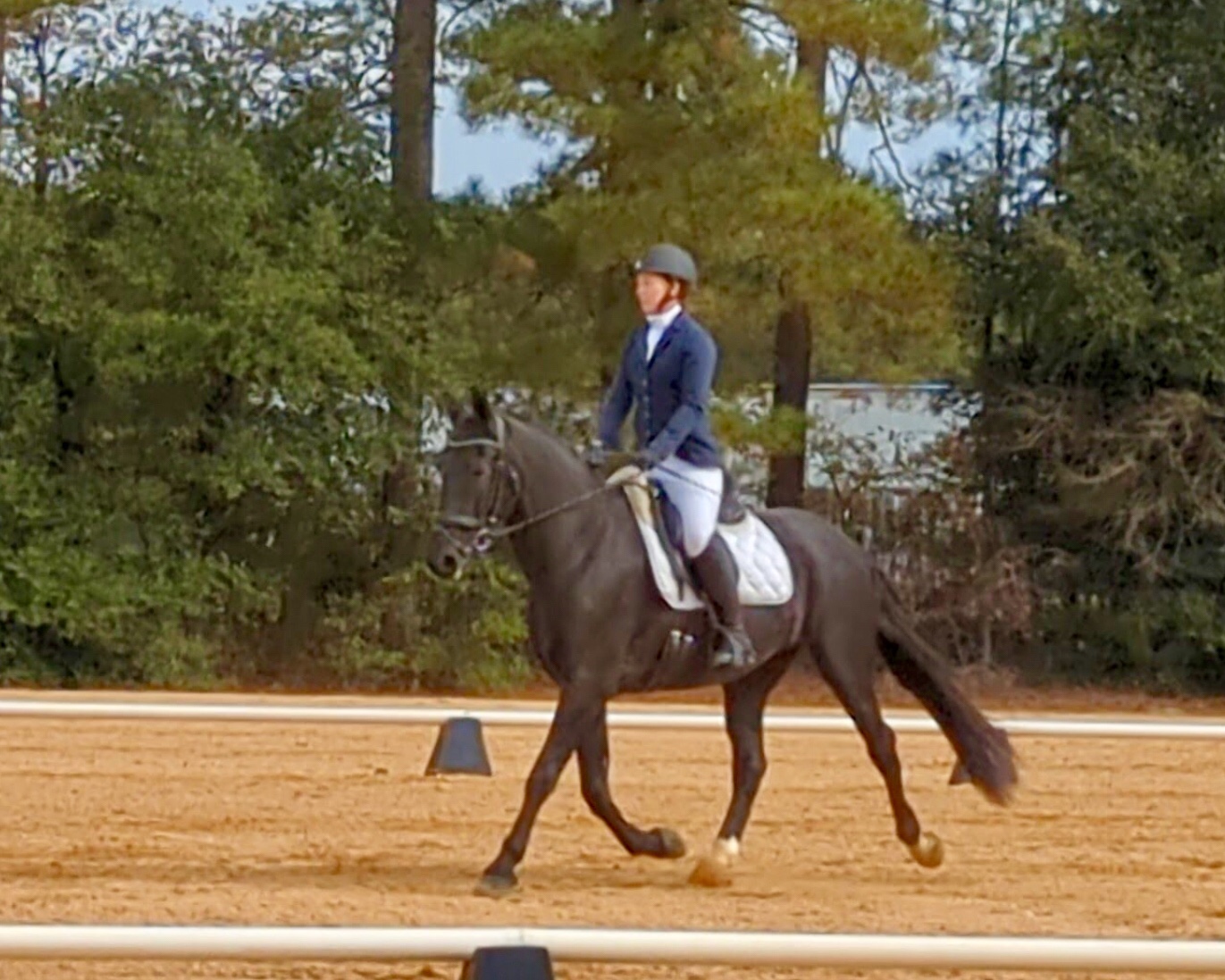 Then Amber’s horse Jetta (14 yr. Fresian Qtr. cross mare) unexpectedly stumbled during the canter work of her Championship T-1 test, which unseated Amber, and although they were both fine, it still disqualified them from the championships. Luckily, they had a much better test during their 1st-1 ride later that day and scored a 67% which earned her a third in that class, and they were also able to better some movements in that same test on Sunday.