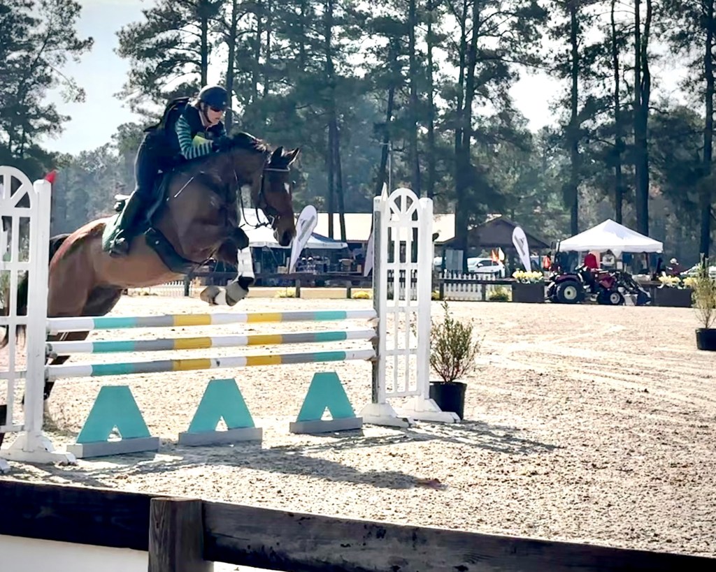 Elizabeth’s own OTTB Obi-1 soared around his Training level stadium round, giving her a great feeling to start the season. She got him a little deep to the last fence on course, a large yellow and white square oxer and he still kept the rails up! She is hoping to get him out at the Training level for some other recognized events this spring. Last season he completed one recognized and one unrecognized. But she’s been working hard to improve his dressage so was pleased with his effort there, even though he thought the water canal next to Ring 2 might eat him for a few movements:)
