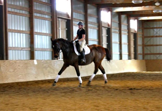 Big Congrats go out to “Kingsley” who is r. old 16 hand OTTB gelding and his new owner Katherine (Kasey) Greene! He is solid in his Training level dressage and schooling all first and 2nd level movements well. He has been primarily used to build several AA and Jr’s riders confidence in the dressage arena including on the lunge line for seat lessons. He jumps small courses and hacks out quietly in the woods by himself and with others in small groups. He evented Beginner Novice lightly with his previous owner and is now enjoying teaching Kasey the ins and outs of both riding outside the arena as well as introducing her to dressage. He is also being half leased currently by Hannah McDiarmid. We look forward to watching them all progress together.