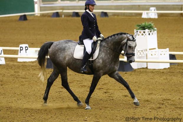 Congratulations to Charlotte Holt on her purchase of “London”, a stunning 7 year old, 16.1 hd. Steel grey Holsteiner/TB cross mare by the Grand Prix Show jumping stallion Laurentino. She won the high score award at the 2017 Labor of Love show in Training test 3 where she scored a 79.77% and has scored above 70% and won multiple other classes as well. She recently debuted at 1st level, scoring a 67.96% in 1st-2 and has been working on all of the 2nd level along with starting her changes. She already does an “auto-change” while jumping, so they should be very easy for her (you can see them in her jumping videos). She is built very attractively, so could easily clean up in the hunter or equitation arenas as well, she went to the Triangle Farms C show and the Finally Farm H/J show here in Raleigh where she was Reserve Champion in the Baby Green Hunters and won her flat class. She is jumping 2’6-2’9 fences quietly including a plastic liverpool, water jump, and small bank,with plenty of scope to go on. Hacks out quietly with others and alone, not spooky. She has been schooling twice to the Carolina Horse Park where she was very well behaved over both the show jumps and small cross country fences. Charlotte hopes to compete her soon in both the eventing and dressage arenas!