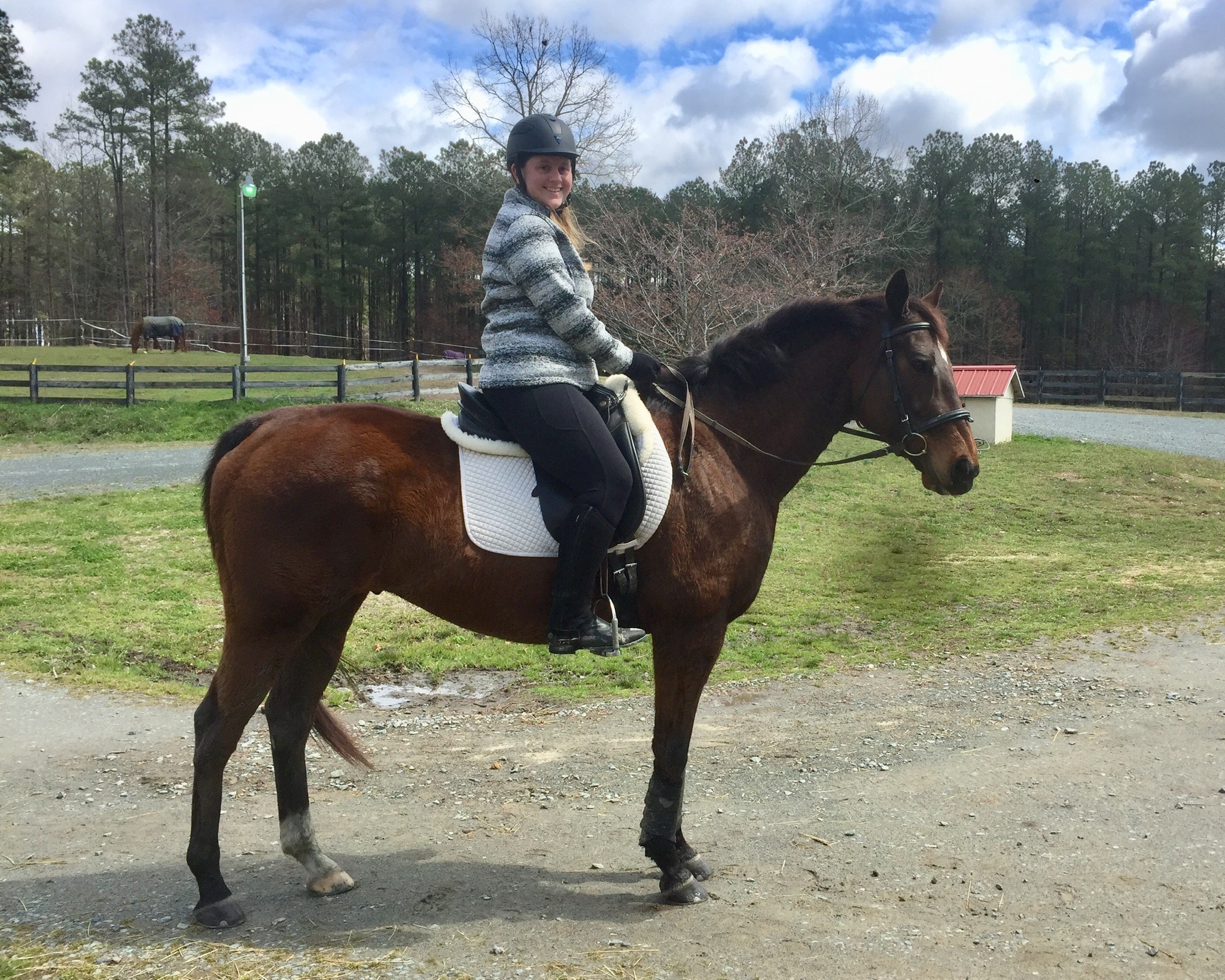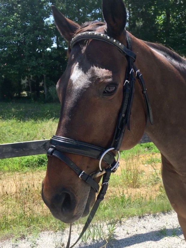 “Finley” has been sold to Jennifer Durazzo, who has renamed him “Kingsley” and will be learning dressage on him as well as allowing her niece to take some jumping lessons on him. He is a lucky fellow and we wish them much success together! Attractive and sweet, solidly built 11 yr. old 16 hd. OTTB gelding. Has some experience at schooling BN events, schooled some Novice X-C and attended one schooling jumper show. Has been doing solid training, schooling first level work in the dressage arena, and is jumping 2’9″-11″ here at home. Not spooky, hacks out quietly. Recent digital podiatry radiographs available.
